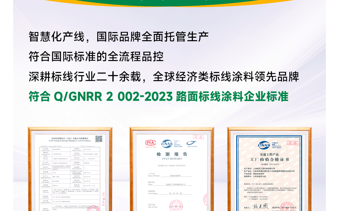 ?專家測評:涂料特點:結(jié)構(gòu)合理、混合均勻、質(zhì)量一致性高 / 玻璃珠含量少 / 用途廣泛,使用方便。執(zhí)行標(biāo)準:中國交通部Q/GNRR 2 002-2023路面標(biāo)線涂料標(biāo)準;