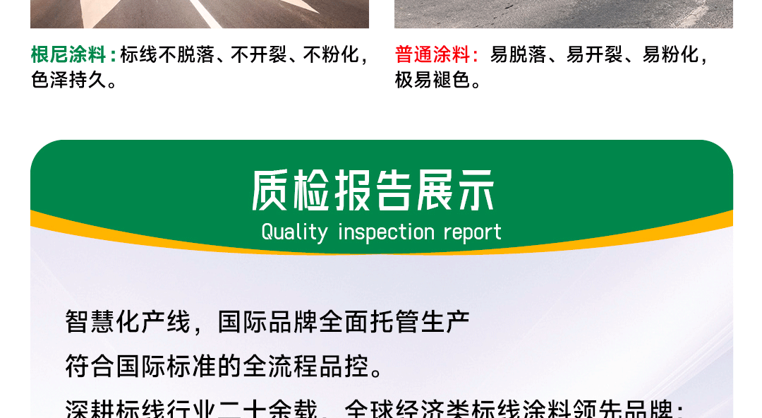 ?專家測(cè)評(píng):標(biāo)線特點(diǎn):優(yōu)質(zhì)苯丙基料、金紅石鈦白/有機(jī)鉻黃顏料、多重優(yōu)質(zhì)助劑、復(fù)合工藝、標(biāo)準(zhǔn)化檢測(cè);色澤好、覆蓋強(qiáng)、宜施工、不起泡,耐磨耐候、品質(zhì)一致性好;執(zhí)行標(biāo)準(zhǔn):中國交通部Q/GNRJ 2 005-2023路面標(biāo)線涂料標(biāo)準(zhǔn);
