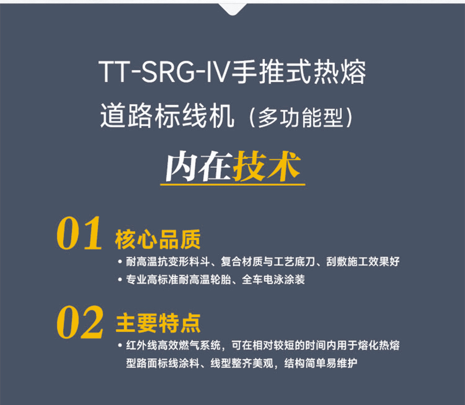 ?專家測評:核心品質(zhì):耐高溫抗變形料斗、復(fù)合材質(zhì)與工藝底刀、刮敷施工效果好。主要特點(diǎn):紅外線高效燃?xì)庀到y(tǒng),可在相對較短的時間內(nèi)用于熔化熱熔型路面標(biāo)線涂料、線型整齊美觀,結(jié)構(gòu)簡單易維護(hù)